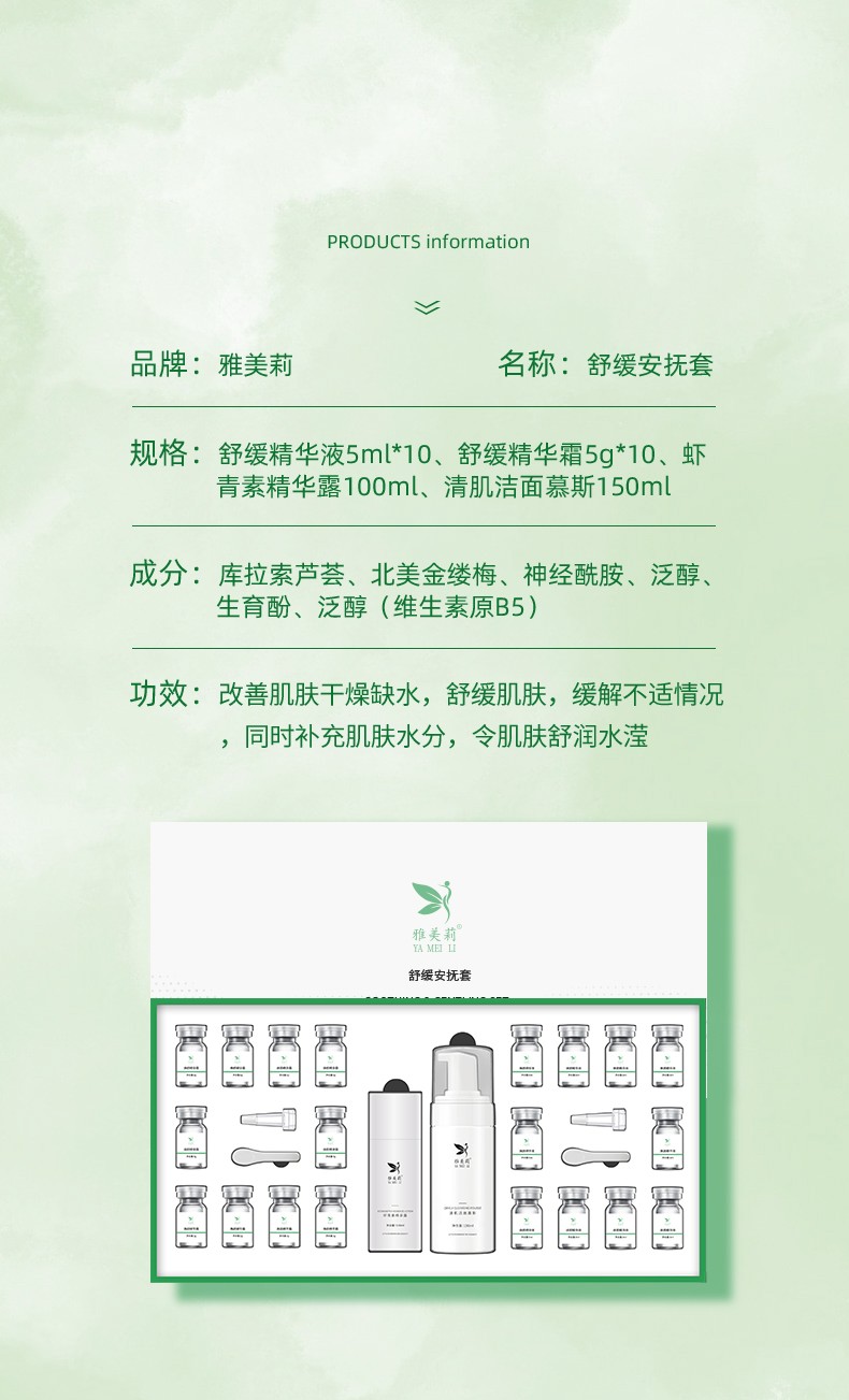 - 说明: 该舒缓安抚套盒为贴牌加工样品展示,并非现货可批发或单独购买!我司主要做全品类护肤品代加工定制,产品品类及功效众多无法一一展示,如需了解更多化妆品代加工可直接联系我司客服人员,感谢您的信赖与选择!
