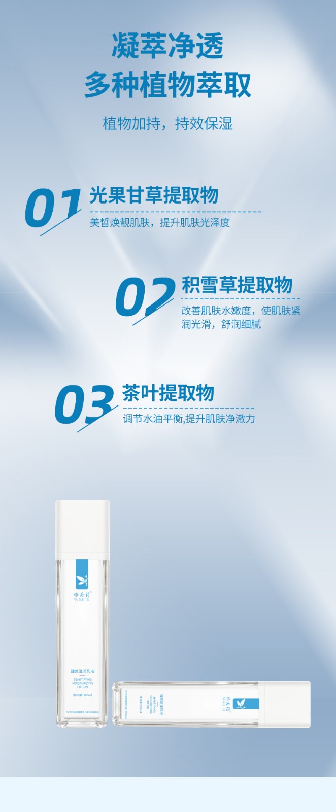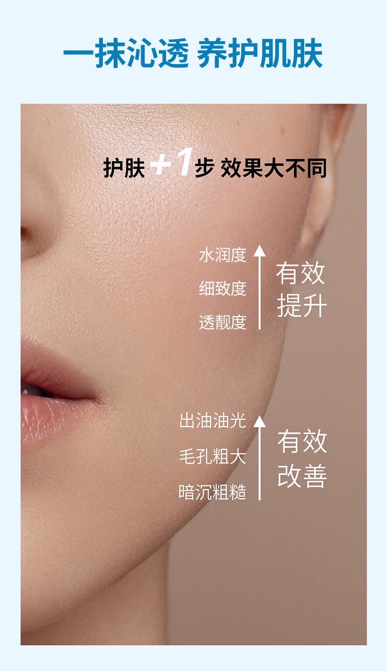 【产品功效】:蕴含植物精华,莹润肌肤干燥缺水状态,令肌肤丝滑柔嫩,绽放动人光泽