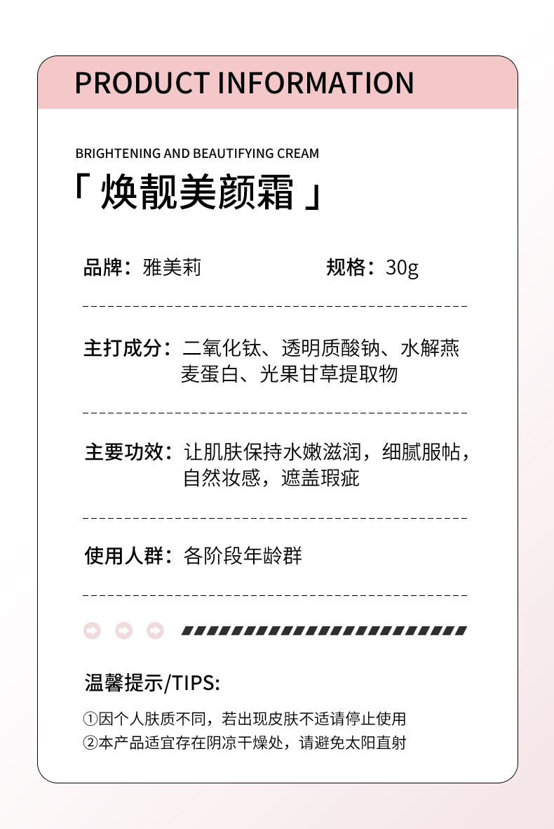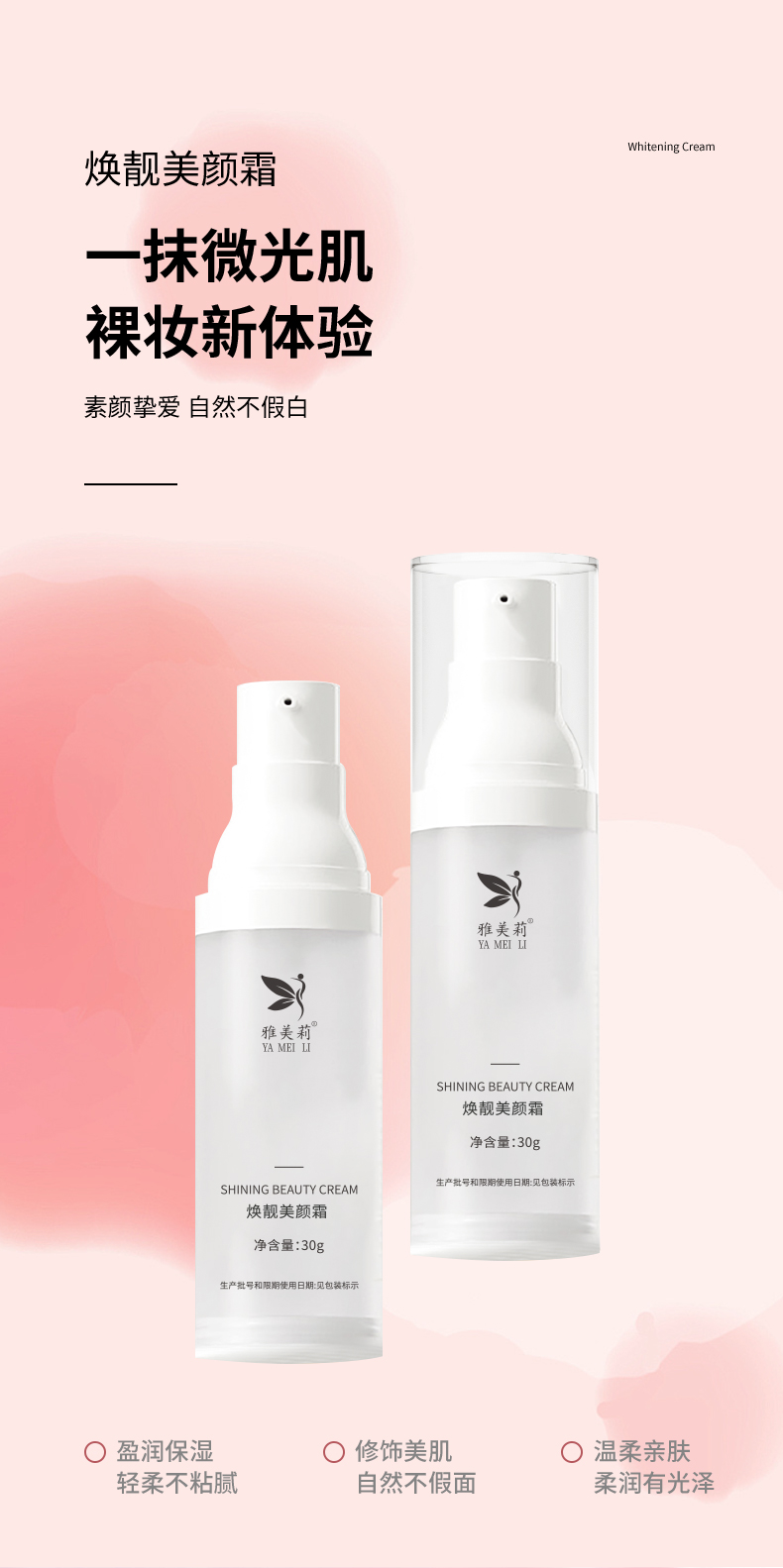 - 说明: 该美颜霜产品为贴牌加工样品展示,并非现货可批发或单独购买!我司主要做全品类护肤品代加工定制,产品品类及功效众多无法一一展示,如需了解更多化妆品代加工可直接联系我司客服人员,感谢您的信赖与选择!