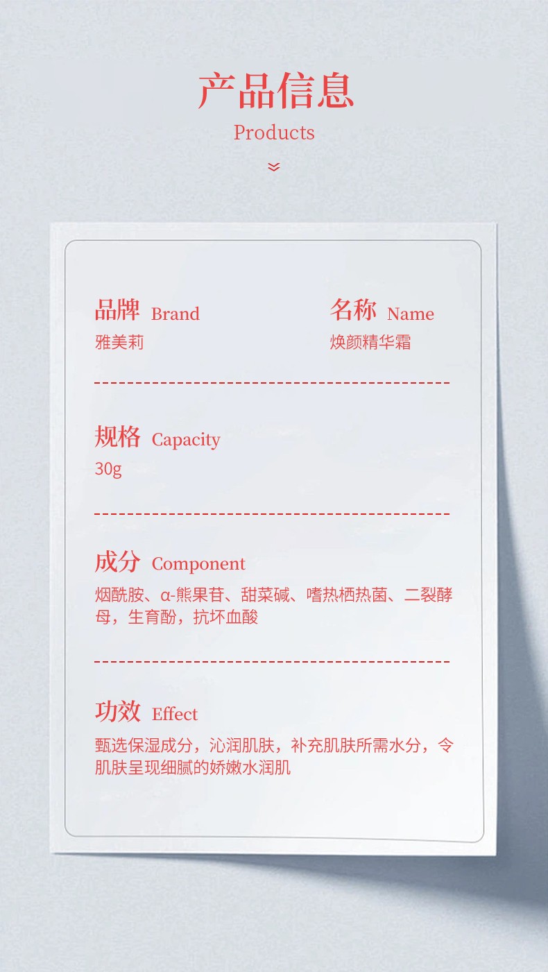 【产品功效】:紧润焕靓,养护肌肤屏障,肌肤焕发靓嫩光采