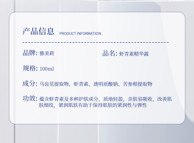 【产品功效】:蕴含虾青素及多种护肤成分,质地轻盈,亲肤易吸收,改善肌肤细纹
