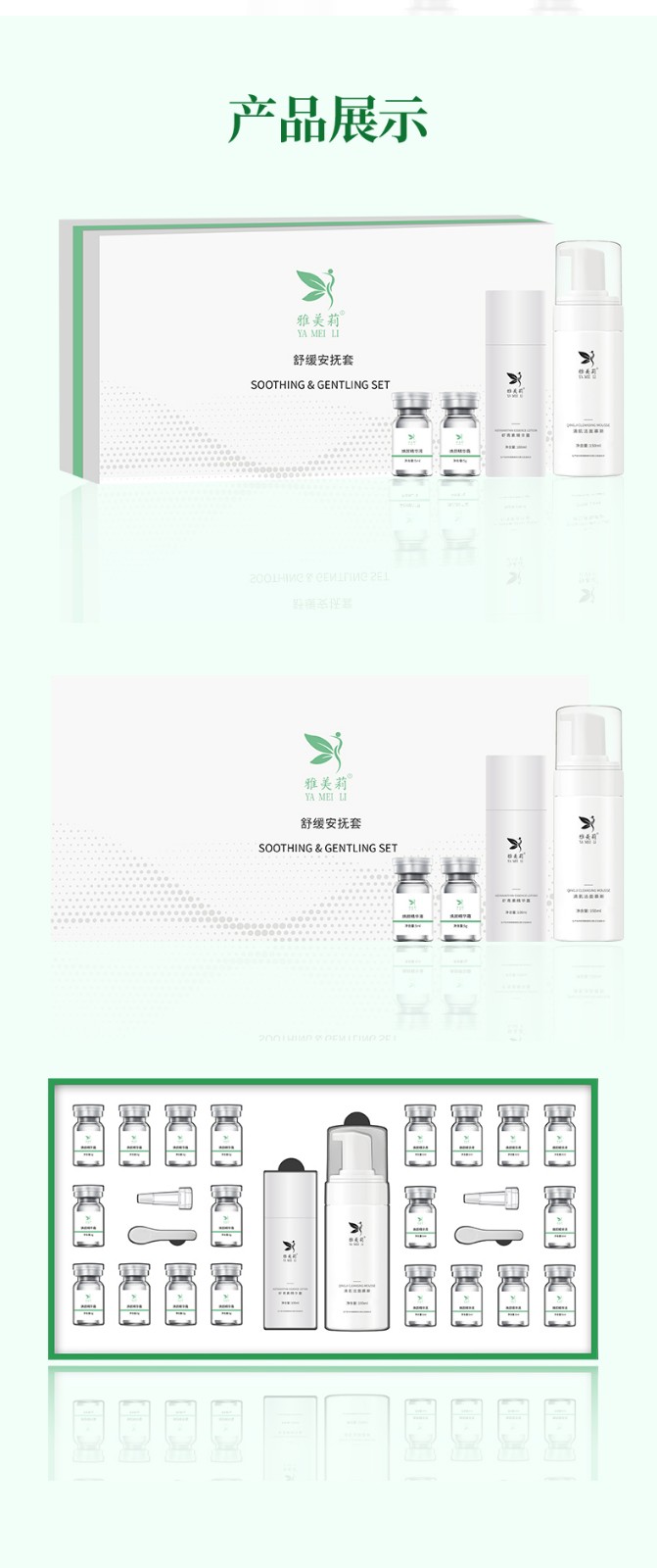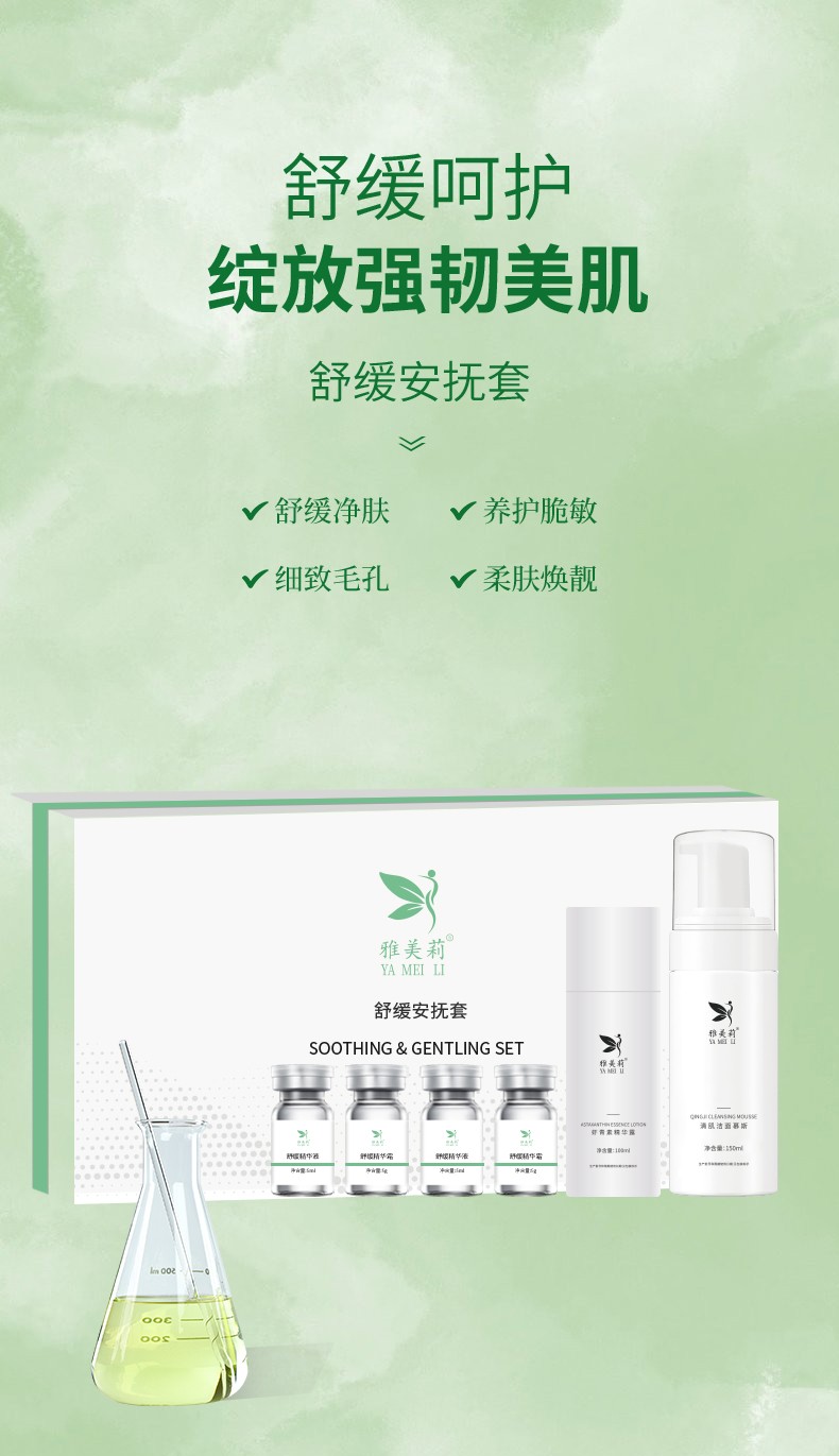 - 说明: 该舒缓安抚套盒为贴牌加工样品展示,并非现货可批发或单独购买!我司主要做全品类护肤品代加工定制,产品品类及功效众多无法一一展示,如需了解更多化妆品代加工可直接联系我司客服人员,感谢您的信赖与选择!