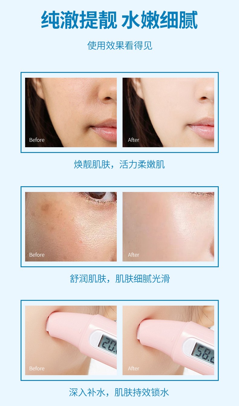 【产品功效】:蕴含植物精华,莹润肌肤干燥缺水状态,令肌肤丝滑柔嫩,绽放动人光泽