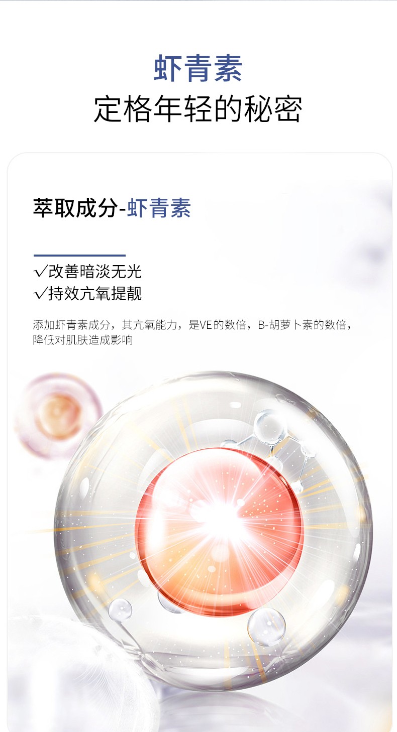 【产品功效】:蕴含虾青素及多种护肤成分,质地轻盈,亲肤易吸收,改善肌肤细纹