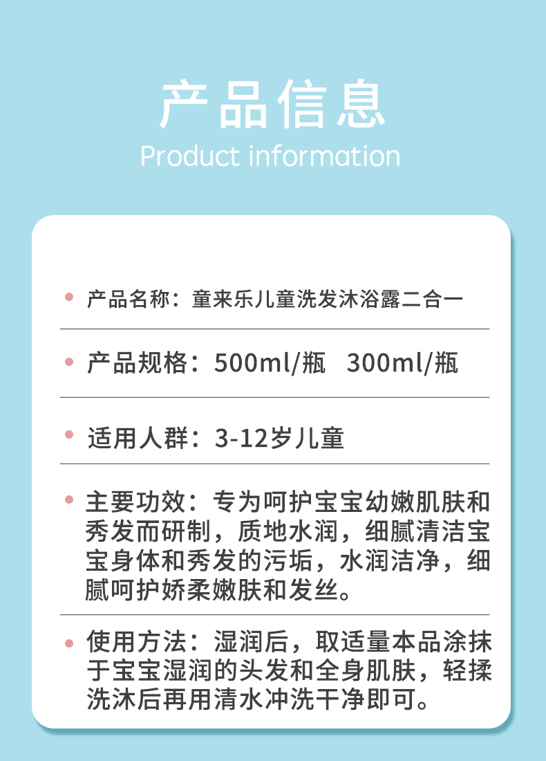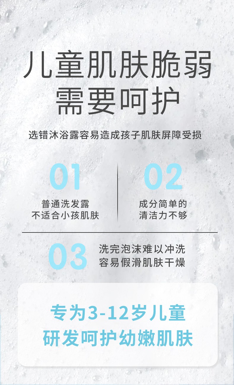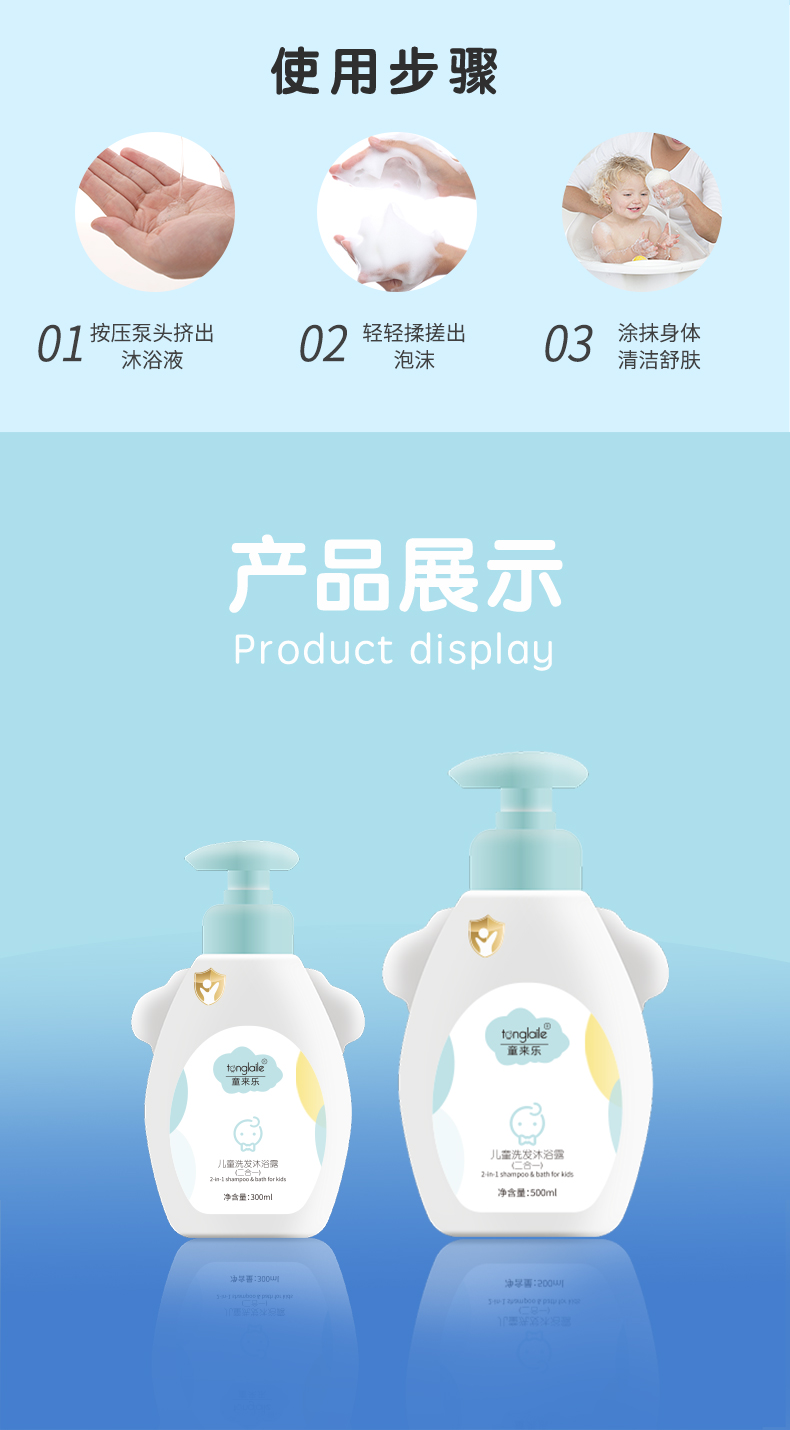 - 说明: 该儿童洗发沐浴露产品为贴牌加工样品展示,并非现货可批发或单独购买!我司主要做全品类护肤品代加工定制,产品品类及功效众多无法一一展示,如需了解更多化妆品代加工可直接联系我司客服人员,感谢您的信赖与选择!