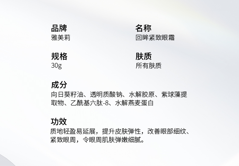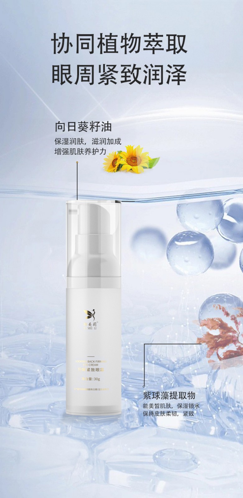 - 说明: 该眼霜产品为贴牌加工样品展示,并非现货可批发或单独购买!我司主要做全品类护肤品代加工定制,产品品类及功效众多无法一一展示,如需了解更多化妆品代加工可直接联系我司客服人员,感谢您的信赖与选择!
